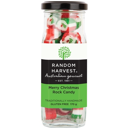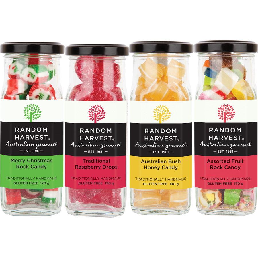Tiny pieces of scrummy hand made rock candy in a selection of delicious flavours presented in a glass jar. Australian made. Gluten Free.