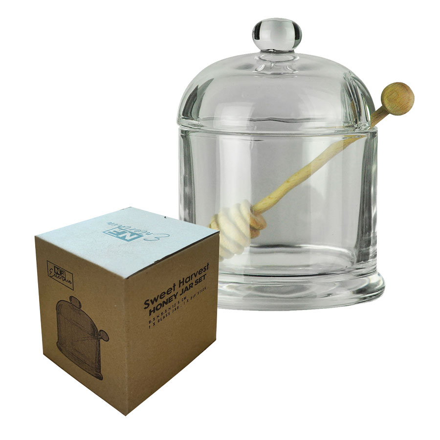 A sweet addition to any kitchen. This glass honey jar set includes a clear jar with lid and a natural timber honey dipper for easy serving. Both stylish and practical, it’s perfect for the breakfast table or as a thoughtful gift. Size: 9.5 x 9.5 x 12.5 cm.
