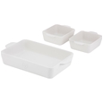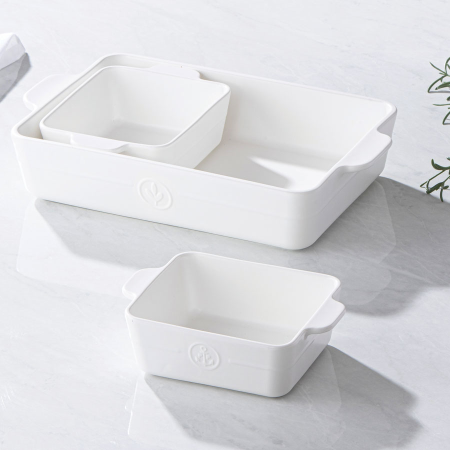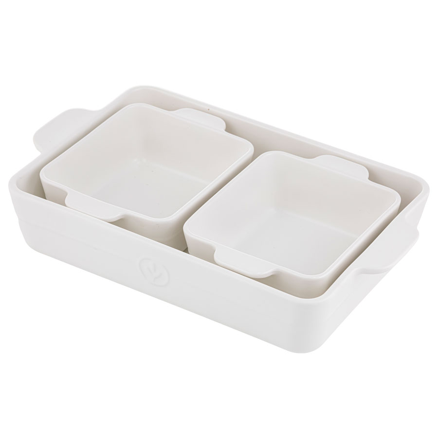 This set of three baking dishes combines style, practicality and clever space-saving design, as they nest neatly together for easy storage. Finished in a sleek white matte glaze with an embossed logo, they bring a modern, clean look to any kitchen. Dishwasher, microwave and oven safe.