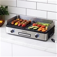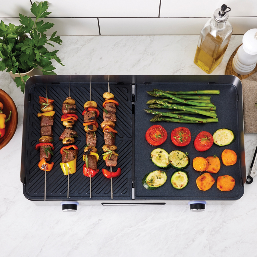 This 2400W Electric BBQ Grill features two large, textured cooking plates with independent 5-level temperature control for versatile grilling. Use one or both non stick cooking surface plates to suit your needs. Each plate is removable for easy cleaning, while the detachable anti-splatter baffle helps keep your cooking area tidy. A built-in drip tray collects excess oil, promoting healthier meals with less mess – making it the ideal addition to your kitchen or outdoor setup. Includes a 2-Year Warranty. Dimensions: 52W x 30D x 15.4H cm. Weight: 4.87 kg.
