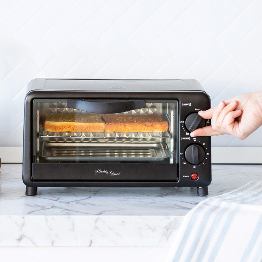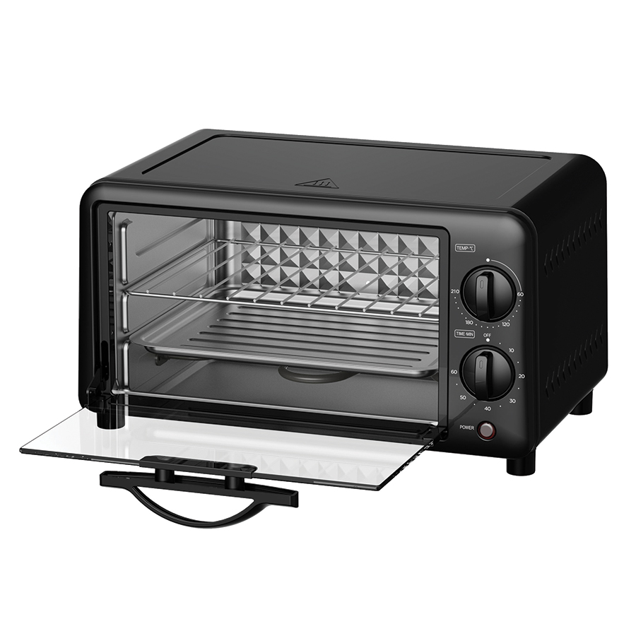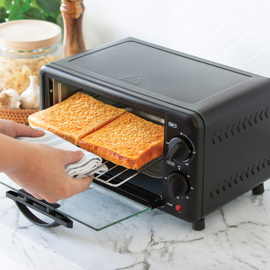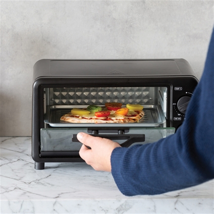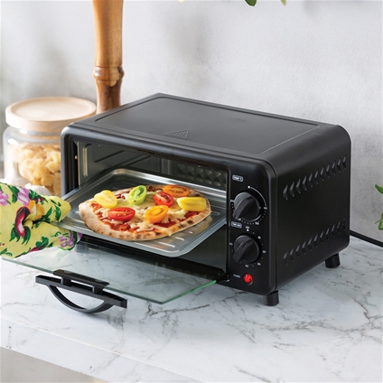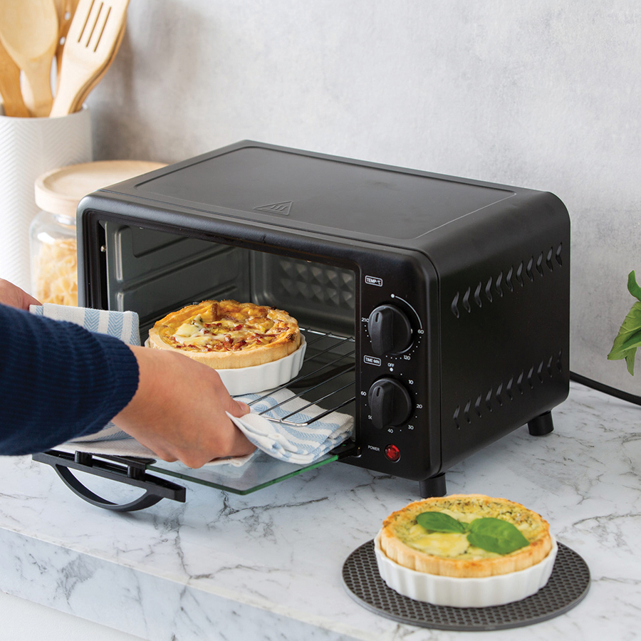 This 10L Toast and Bake Oven brings versatile cooking to your countertop – or even your caravan. Bake, toast and roast everything from pizzas, bread and cakes to meats, fish and vegetables.’. Fast-heating top and bottom elements ensure even results, while the adjustable temperature up to 210°C and a 60-minute timer give full control. The glass door makes monitoring easy and the compact oven includes a galvanised steel inner wall, a wire rack, chrome-plated iron accessories and an aluminised iron baking tray. Cook, toast, roast… then wipe clean in no time.